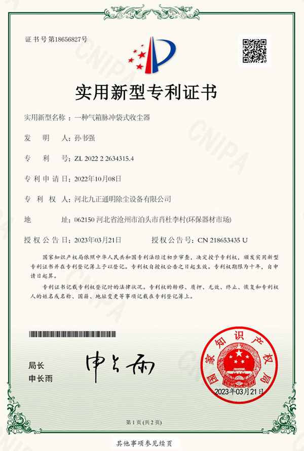 九正通明-一种气箱脉冲袋式收尘器专利证书