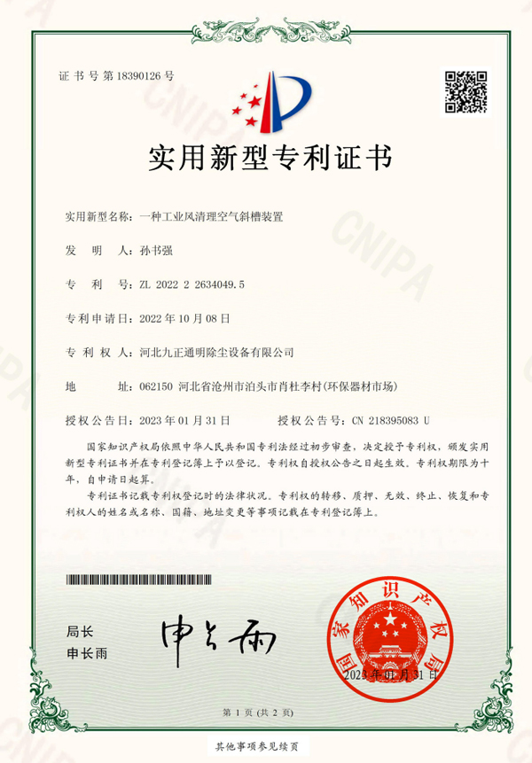 九正通明-一种工业风清理空气斜槽装置专利证书