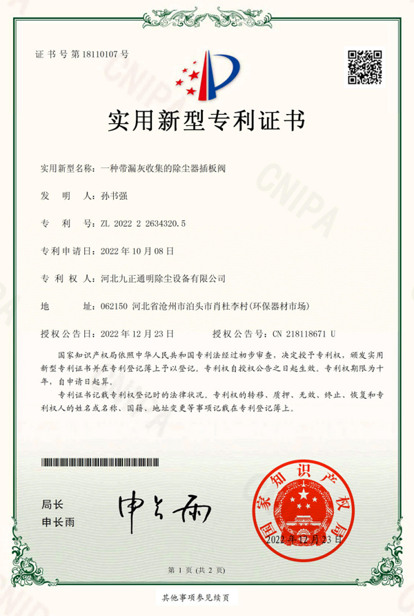 九正通明-一种带漏灰收集的除尘器插板阀专利证书